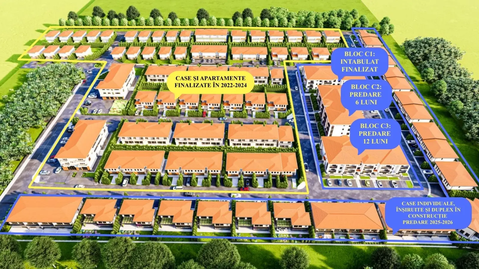 Cartierul ESQ Village 3 contine in total 200 de case (70 individuale, 12 de tip duplex, 118 insiruite), 5 blocuri cu regim de inaltime mic P+2 cu spatii comerciale la parter, loc de joaca pentru copii, asfalt in incinta complexului si este situat in zona Galata, pe Soseaua Iasi-Voinesti (recent reabilitata/largita) in spatele Pepinierei Silvice Galata, la doar 100 m de strada principala.